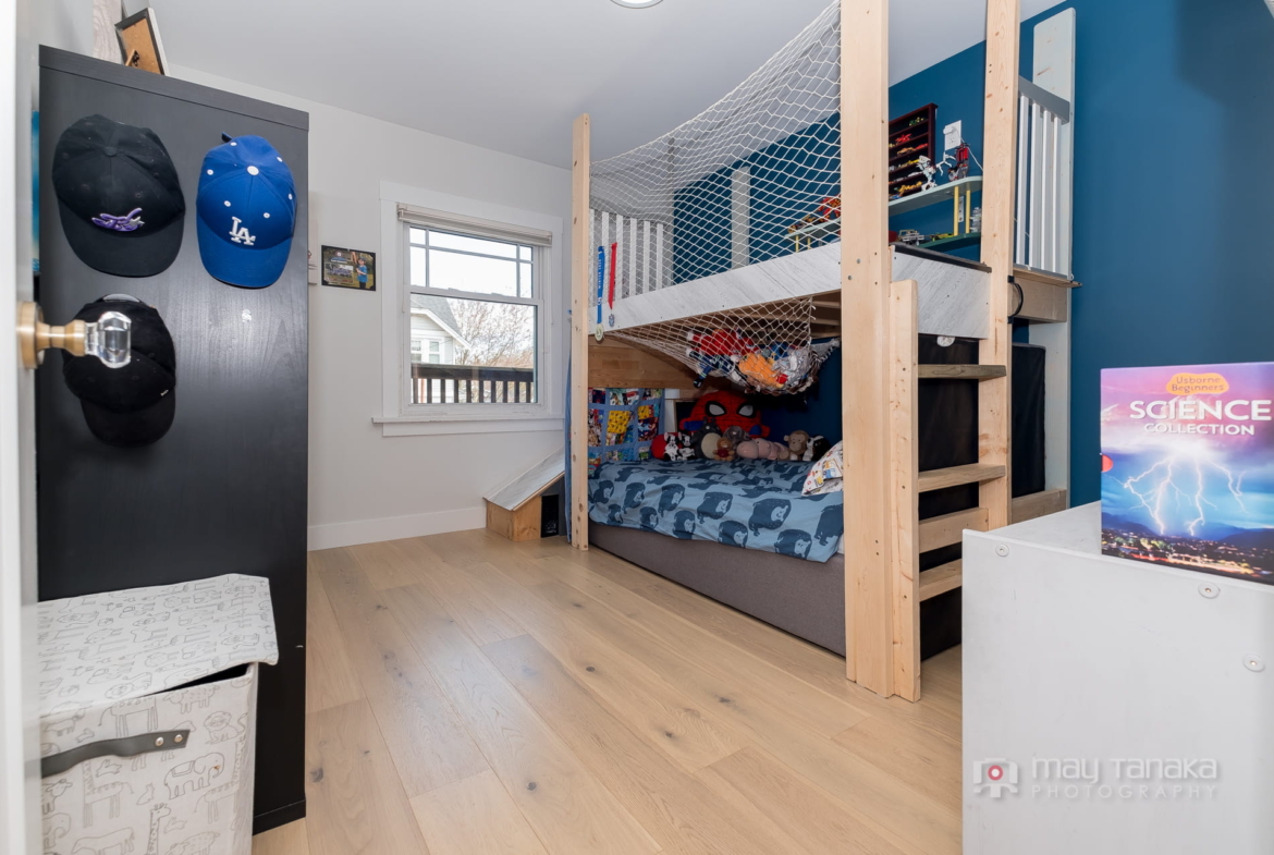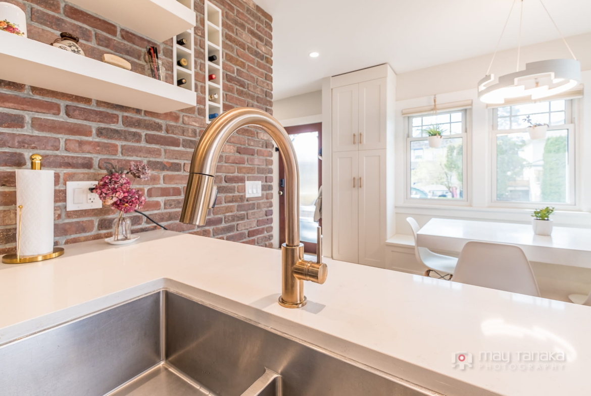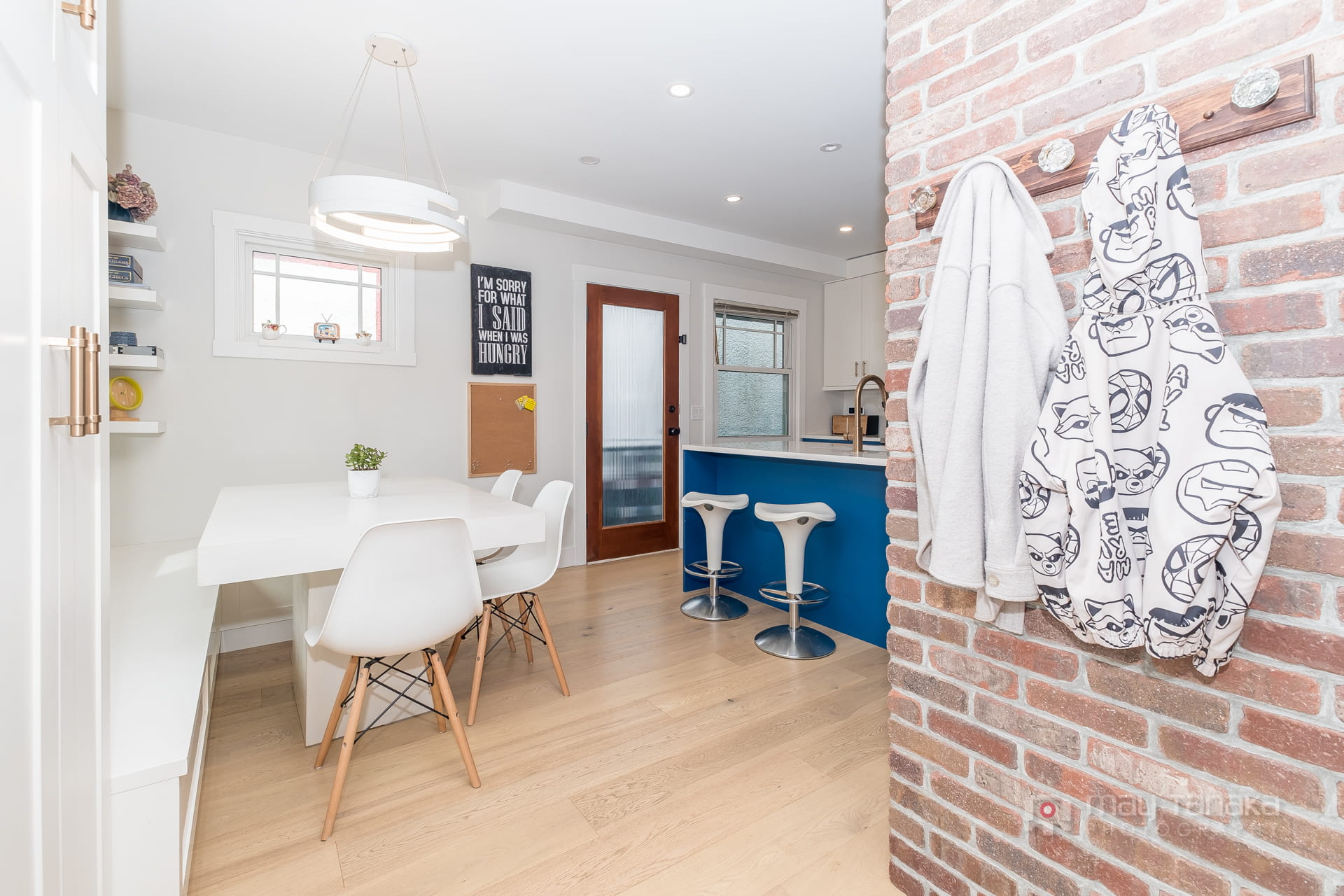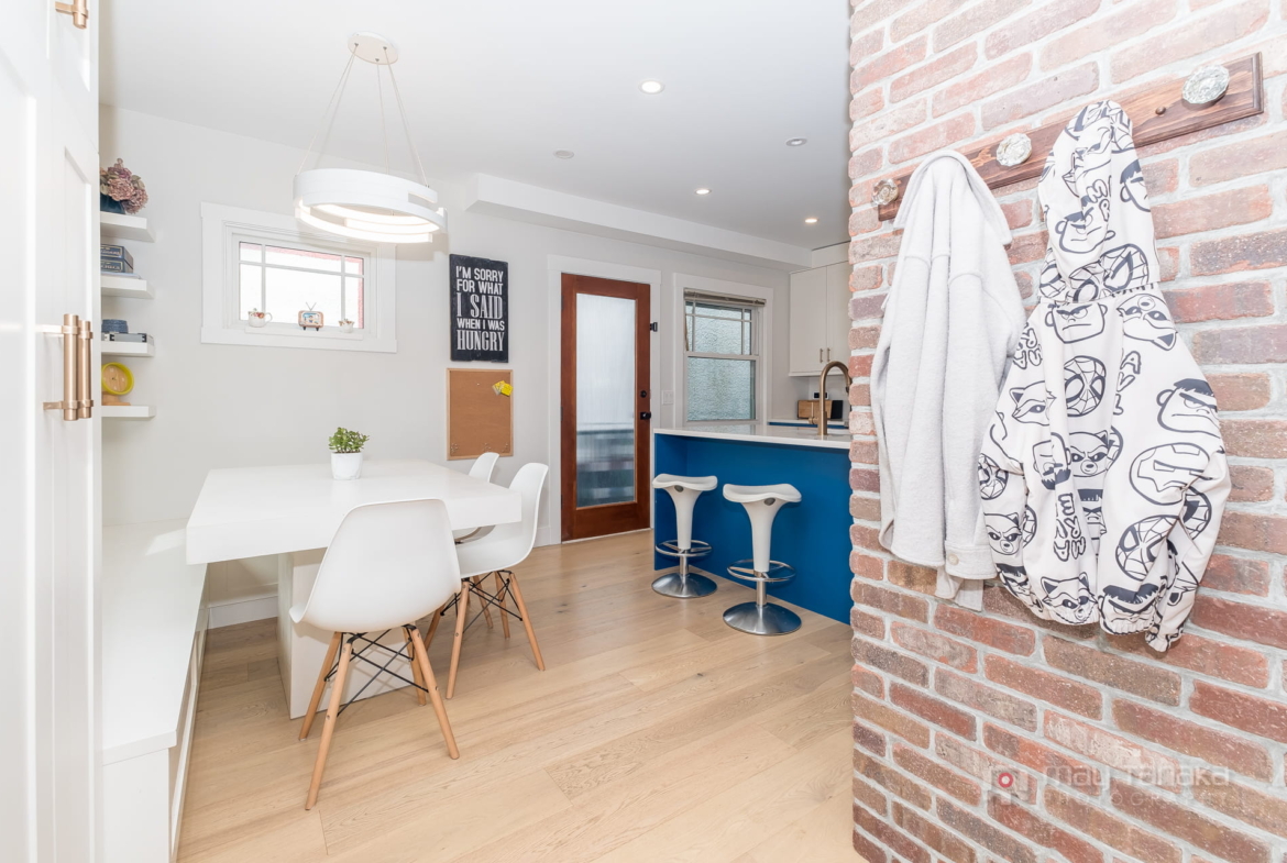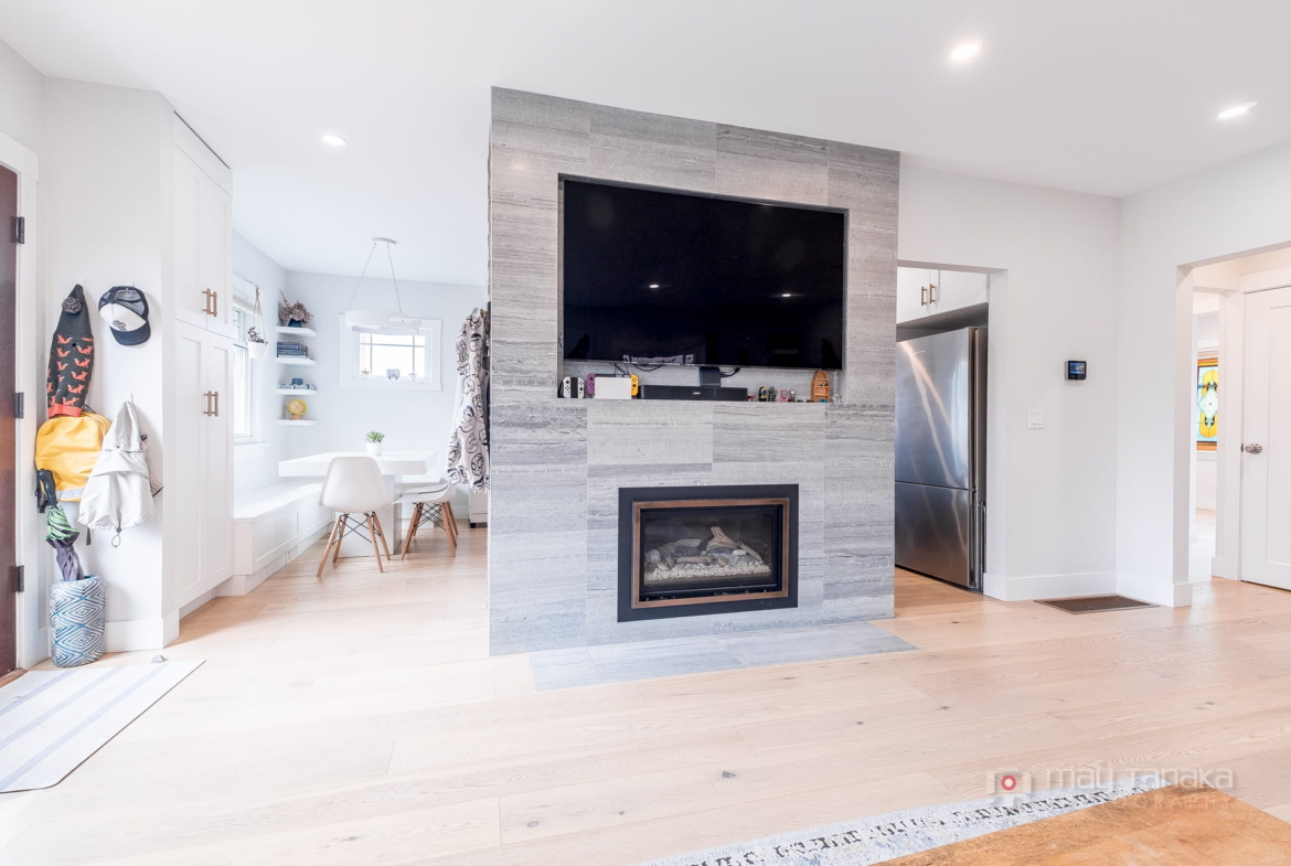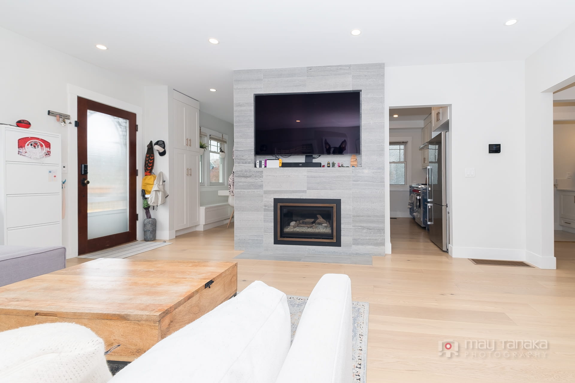 The main floor updates include: Wolf range & hood fan, Fisher & Paykel fridge, bronzed gold pull down faucet and matching hardware, caesarstone countertops, banquette seating, recessed lighting and LED dining light fixture. The gas fireplace was built with a custom fit TV enclosure, wide plank oak hardwood throughout and ample matching storage cabinets.